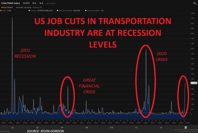 US job cuts in transportation are flashing at recession-like levels, with 31,243 job cuts in January 2025, driven by UPS planning up to 30,000 cuts.