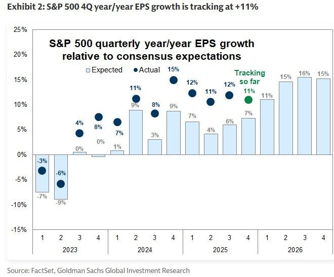 Earnings are not collapsing. In fact, Q4 EPS growth is tracking around +11% Y/Y versus ~7% expected. That’s real strength.