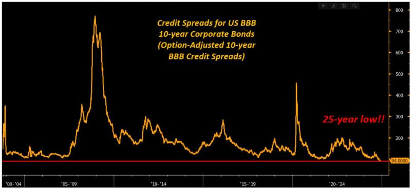 BBB corporate spreads are sitting at 94bps, their tightest in 25 years.