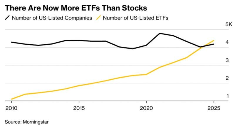 And I cannot ignore the ETF explosion: today, the U.S. has more ETFs (4,300) than listed companies (4,200).