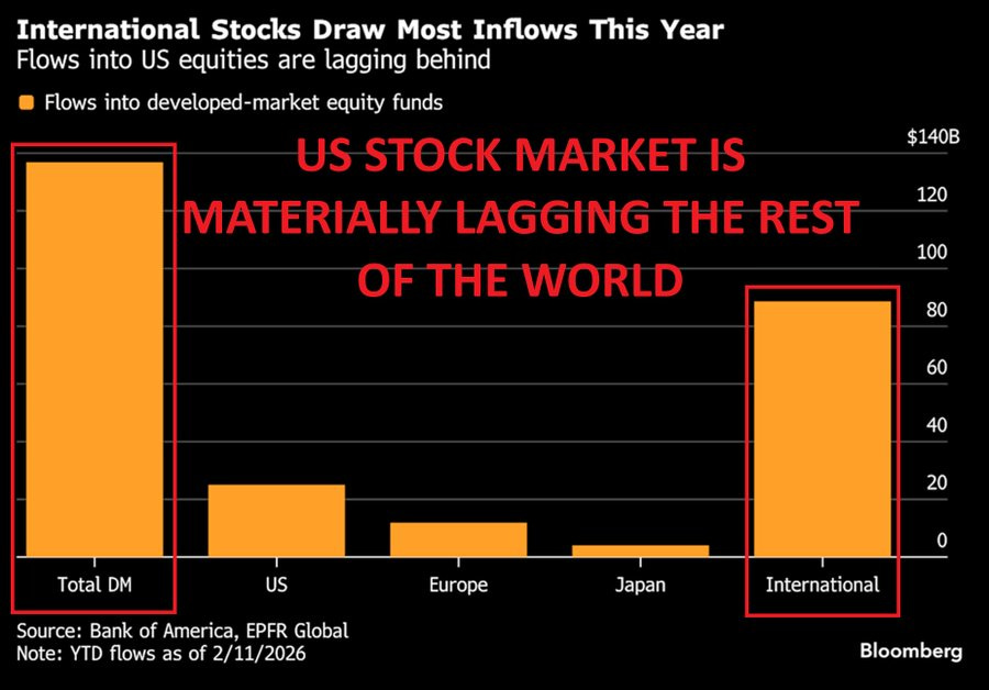 Investors are rotating out of US stocks at a historic pace. International equity funds have attracted +$104bn in net inflows YTD, which is four times the +$25bn that flowed into US funds. Developed markets have seen nearly $140bn of inflows.