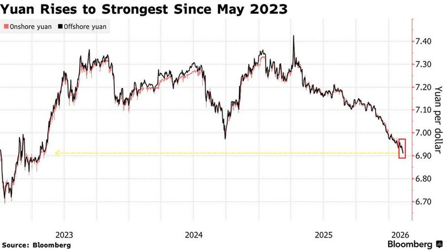 The Chinese Yuan has strengthened to 6.91 per USD, the strongest since May 2023.